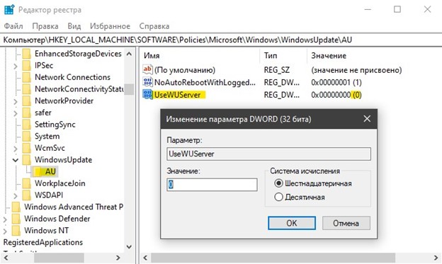 Теперь выделите папку AU и слева нажмите на пустом поле правой кнопкой мыши и выберите «Создать» > «Строковый параметр» с именем UseWUServer и значением 0. Обычно срабатывает без перезагрузки, но можно и с ней.
