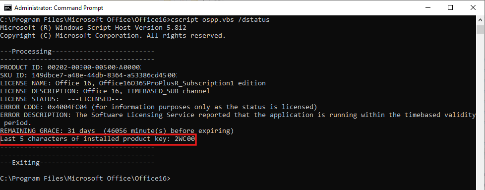 Если для приложений, лицензии которых вы хотите удалить, возвращается частичный ключ продукта, обратите внимание на значение, отображаемое для последних 5 символов установленного ключа продукта, для использования на шаге ниже.