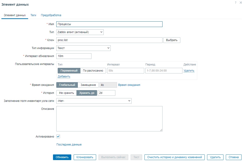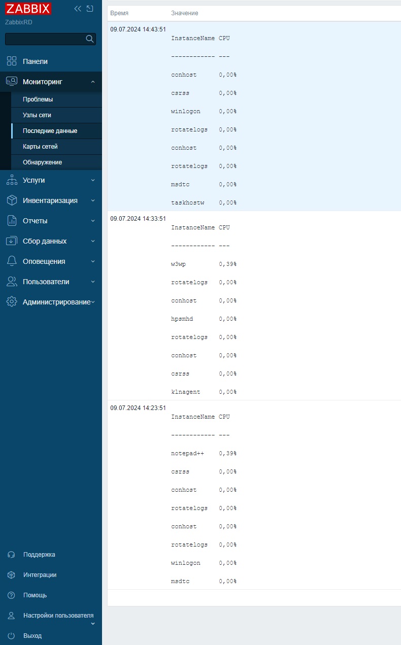 UserParameter=proc.list,powershell -Command "(Get-Counter '\Процесс(*)\% загруженности процессора').CounterSamples | Sort-Object -Property cookedvalue -Descending| Select-Object -First 10| Where-Object InstanceName -NotMatch '^(?:idle|_total|system)$' | ft InstanceName,@{L='CPU';E={($_.Cookedvalue/100/$env:NUMBER_OF_PROCESSORS).toString('P')}}"